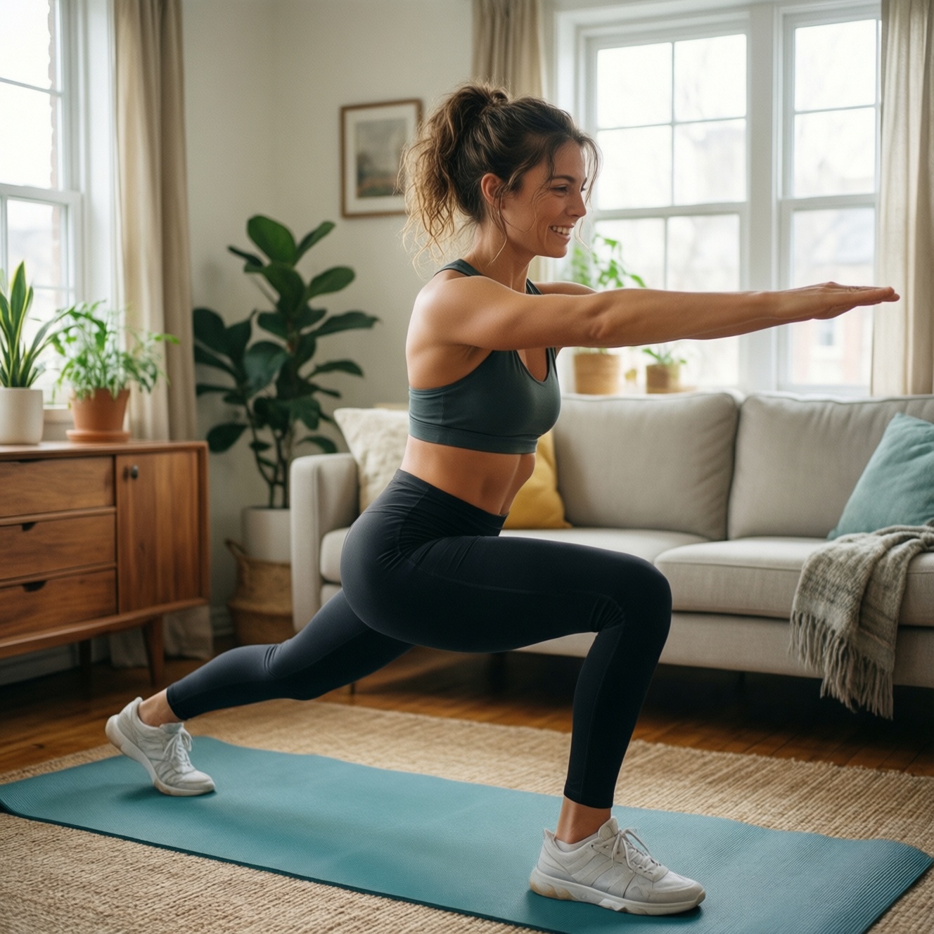 Кому подходит: intermediate, кто хочет "включить" тело за 6-8 минут, улучшить осанку и визуально освежить лицо через мягкую активацию кровотока. Это базовый вариант "фитнес дома мини тренировки" без прыжков.